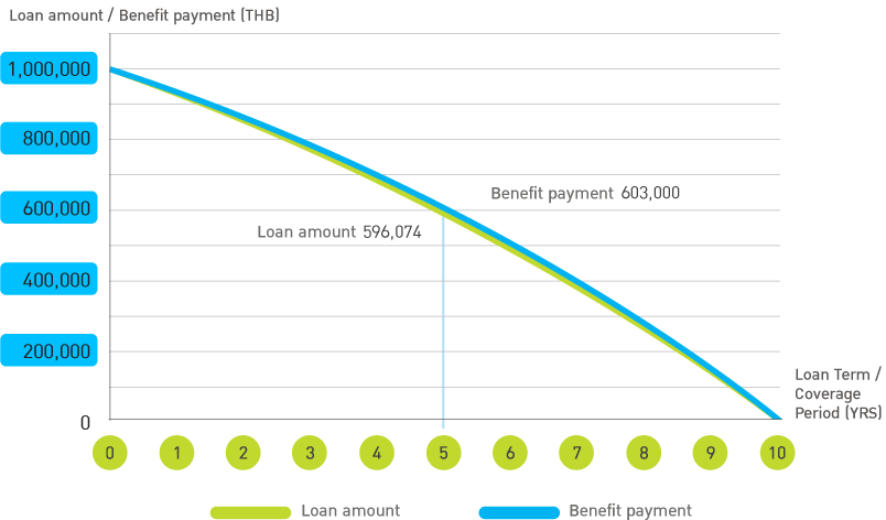 Example : A customer applied for a housing loan in the amount of 1,000,000 THB for a 10-year loan term, at the MLR (Minimum Loan Rate) of 7.13%* while holding an assurance with sum assured of 1,000,000 THB for a coverage period of 10 years. From the graph, the benefits to be paid by the company will be more than the debts.