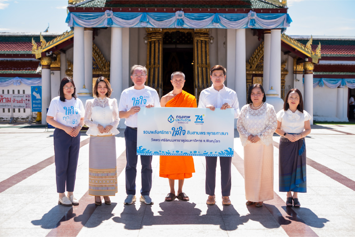 บริษัท กรุงเทพประกันชีวิต จำกัด (มหาชน) จัดกิจกรรม “รวมพลังศรัทธา ใส่ใจพระพุทธศาสนา” เนื่องในโอกาสครบรอบ 74 ปี สานต่อพันธกิจขององค์กรในรื่องการใส่ใจชุมชนและสังคม ภายใต้แนวคิด ใส่ใจพุทธศาสนา เพื่อความสุขที่ยั่งยืน โดยมีผู้บริหาร นายจักรพงศ์ แสงแก้ว ผู้ช่วยผู้จัดการใหญ่ สายงานตัวแทนและที่ปรึกษาทางการเงิน (ที่ 3 จากขวา) นางลัดดาวัลย์ สิทธิวรนันท์ ผู้ช่วยผู้จัดการใหญ่ สายช่องทางสถาบันการเงินและพันธมิตรทางธุรกิจ (ที่ 2 จากขวา) และ นางสาวอรนาฎ นชะพงษ์ ผู้ช่วยผู้จัดการใหญ่ สายกลยุทธการตลาดและบริหารจัดการลูกค้า (ที่ 2 จากซ้าย) ร่วมมอบเต็นท์ ต้นไม้ ชุดโต๊ะ และม้านั่ง เพื่องานสาธารณประโยชน์ พร้อมจัดพิธีทำบุญถวายภัตตาหารเพลแด่พระสงฆ์ และจัดซุ้มอาหารโรงทาน เพื่อเลี้ยงอาหารแก่ประชาชนที่มาร่วมงานและสักการะพระพุทธชินราช ให้ได้อิ่มบุญ อิ่มใจ และอิ่มท้องไปพร้อมกัน ณ วัดพระศรีรัตนมหาธาตุวรมหาวิหาร จังหวัดพิษณุโลก