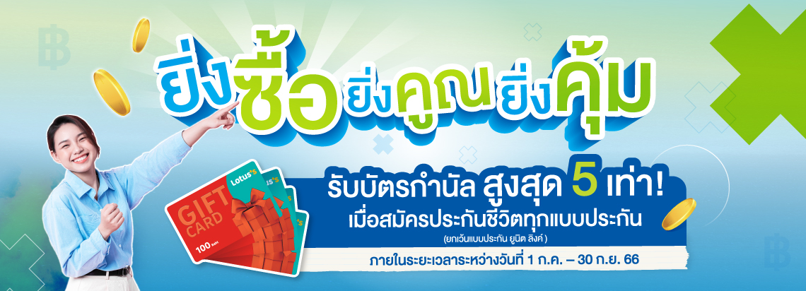 - สำหรับกรมธรรม์ที่มีเบี้ยประกันภัยต่อกรมธรรม์ ถึง 100,000 บาท รับเพิ่ม บัตรกำนัลมูลค่า คูณ 3 ของบัตรกำนัลที่ได้รับ