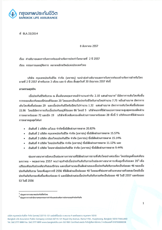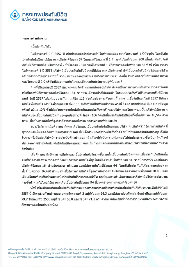 คำอธิบายและวิเคราะห์ของฝ่ายจัดการ ไตรมาสที่ 2 สิ้นสุดวันที่ 30 มิ.ย. 2557 (MD&A)