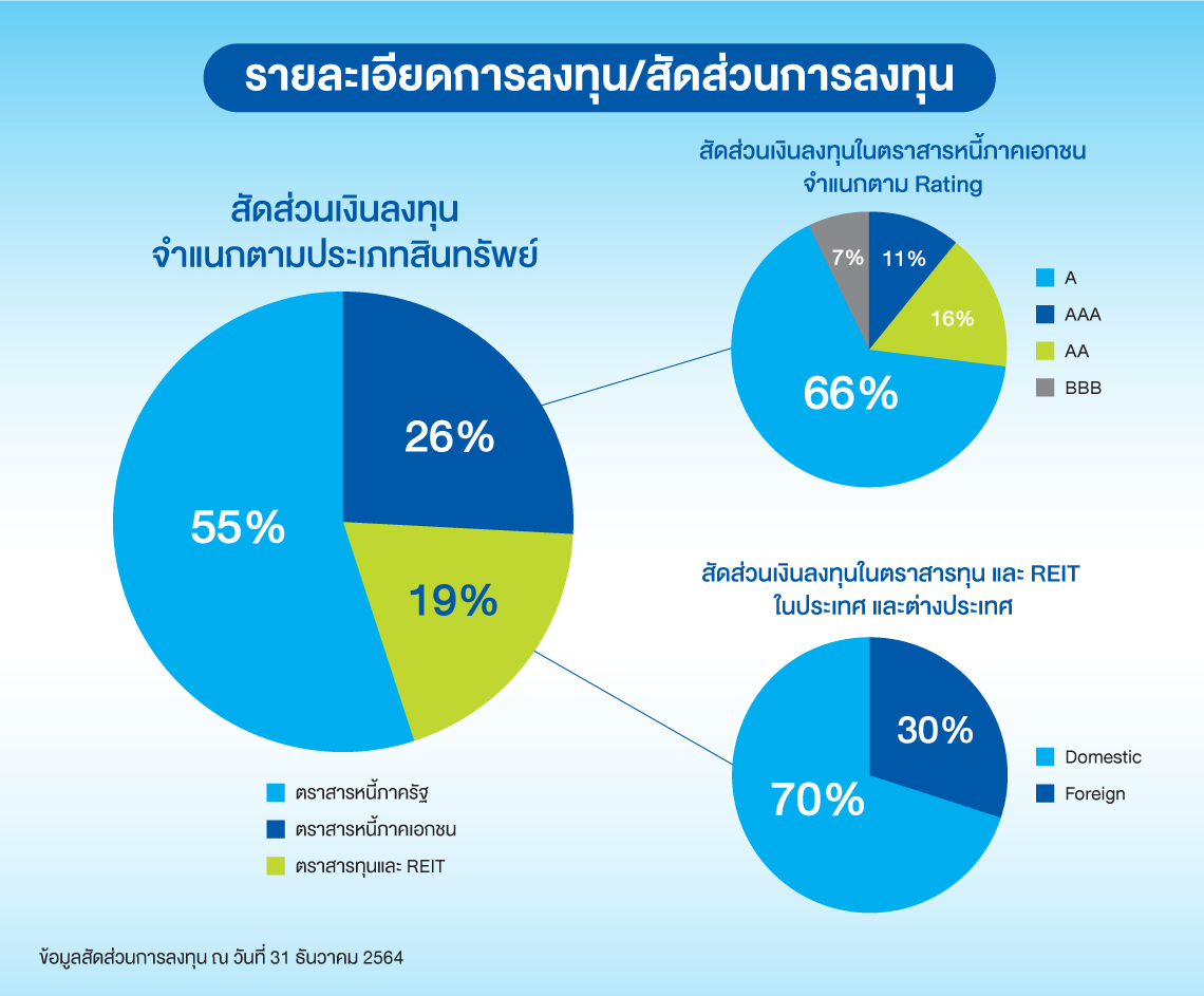 นโยบายการจัดสรรเงินลงทุนจะเน้นการลงทุนในตราสารหนี้ภาครัฐและภาคเอกชนเป็นสัดส่วนประมาณร้อยละ 80 ของพอร์ทการลงทุน และอีกร้อยละ 20 จะลงทุนในสินทรัพย์ทางการเงินที่มีความเสี่ยงสูงขึ้นเช่นหุ้นสามัญ และ REIT ทั้งในประเทศและต่างประเทศ เพื่อเพิ่มโอกาสในการได้รับผลตอบแทนที่สูงขึ้น