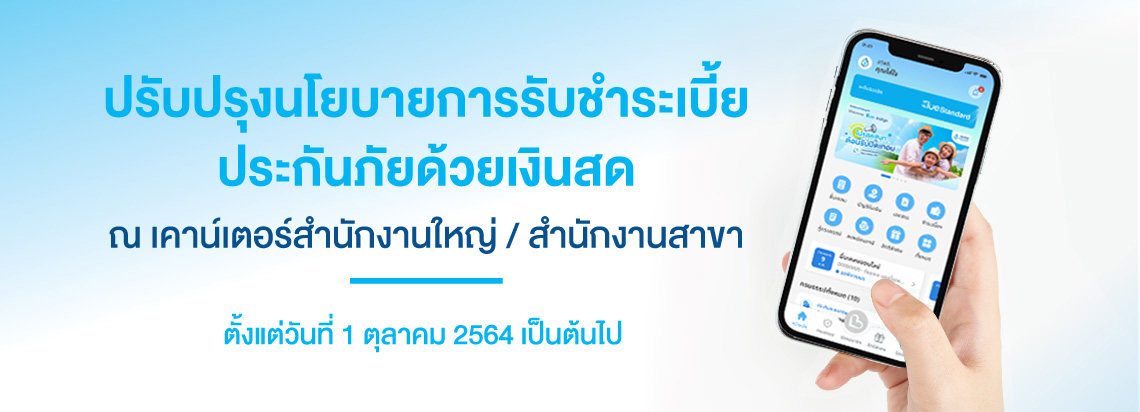 เพื่อเตรียมพร้อมในการก้าวสู่สังคมไร้เงินสด และความสะดวกปลอดภัยยิ่งขึ้นในการชำระเบี้ยประกันภัย บริษัทจึงได้ปรับปรุงนโยบายการรับชำระเบี้ยประกันภัยด้วยเงินสด ณ เคาน์เตอร์สำนักงานใหญ่ สำนักงานสาขาโดยกำหนดการรับชำระด้วยเงินสด ณ เคาน์เตอร์ สำนักงานใหญ่สำนักงาน สาขา ดังนี้