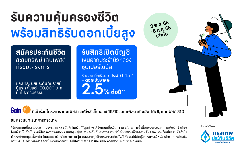- ลูกค้าที่มีบัญชีเงินฝากประจำบัวหลวงซุปเปอร์โบนัสตามโครงการ Gain & Save Phase 1 สามารถเข้าร่วมโครงการ Gain & Save Phase 2 ได้ โดยสมัครทำประกันชีวิตและฝากเงินเข้าบัญชีเดิม ตามเงื่อนไขของโครงการ Gain & Save Phase 2 โดยไม่ต้องเปิดบัญชีเงินฝากประจำบัวหลวงซุปเปอร์โบนัส (2)