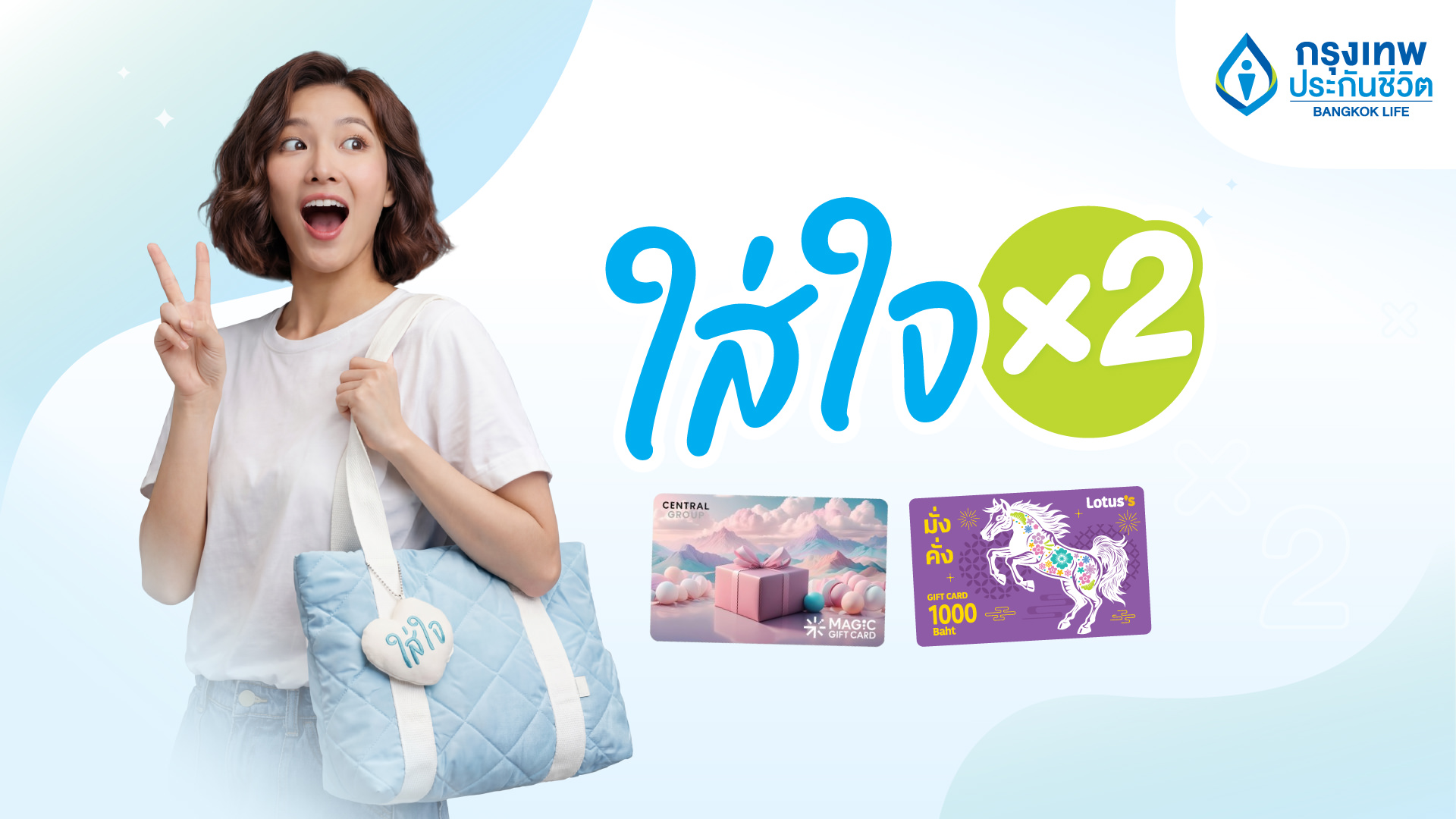 - แบบที่2: ลูกค้าสมัครทำประกันชีวิต แบบประกัน กรุงเทพ สุดคุ้ม และชำระเบี้ยประกันภัยปีแรกแบบรายปี 200,000 บาท และดำเนินการครบตามเงื่อนไขโครงการ ลูกค้าสามารถเลือกรับบัตรกำนัลโลตัส หรือ บัตรกำนัลเซ็นทรัล มูลค่า 4,000 บาท และกระเป๋าใส่ใจ Fluffy Bag จำนวน 1 ใบ