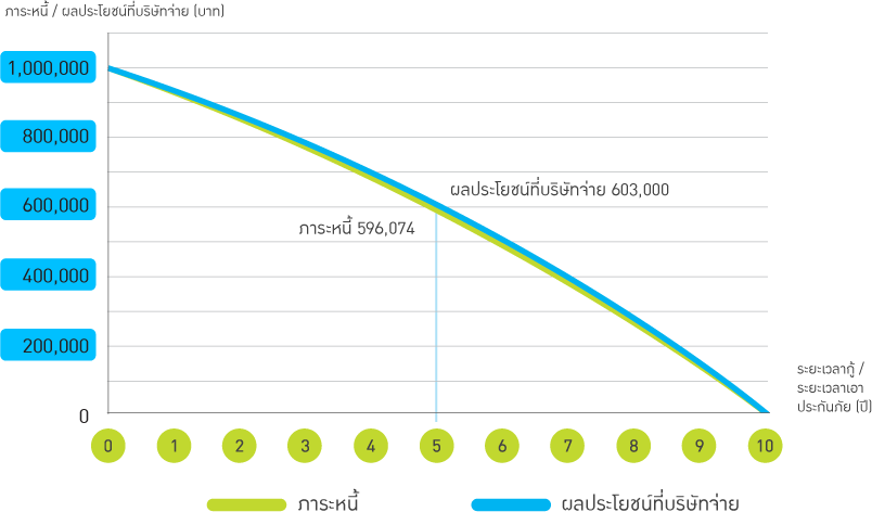 ตัวอย่าง ลูกค้ากู้สินเชื่อเพื่อที่อยู่อาศัยในวงเงินกู้ 1,000,000 บาท ระยะเวลากู้ 10 ปี ดอกเบี้ยเงินกู้ MLR 7.13%* โดยลูกค้าทำ ประกันในจำนวนเงินเอาประกันภัย 1,000,000 บาท และระยะเวลาเอาประกันภัย 10 ปี จากกราฟ จะเห็นว่าผลประโยชน์ ที่บริษัทจ่ายจะมากกว่าภาระหนี้