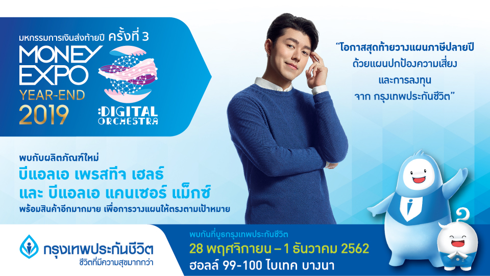 กรุงเทพประกันชีวิต ชวนชาวกรุงเทพวางแผนภาษีโค้งสุดท้ายก่อนปีใหม่ สร้างหลักประกันอย่างมั่นคงและวางแผนการเงินให้ครบครัน ในงานมหกรรมการเงินส่งท้ายปี ครั้งที่ 3 Money Expo Year End 2019 โดยกรุงเทพประกันชีวิตยกทัพผลิตภัณฑ์ที่ตอบโจทย์ความต้องการของทุกคนมากที่สุด ไม่ว่าจะเป็นผลิตภัณฑ์ไฮไลท์สำหรับปี 2562 และผลิตภัณฑ์ที่พร้อมวางแผนลดหย่อนภาษี และยังสามารถขอรับคำแนะนำจากที่ปรึกษาการเงินมืออาชีพฟรี พร้อมโปรโมชั่นมากมาย ที่บูธกรุงเทพประกันชีวิตระหว่างวันที่ 28 พฤศจิกายน 2562 - 2 ธันวาคม 2562 ณ Hall 99-100 ศูนย์นิทรรศการและการประชุมไบเทค บางนา