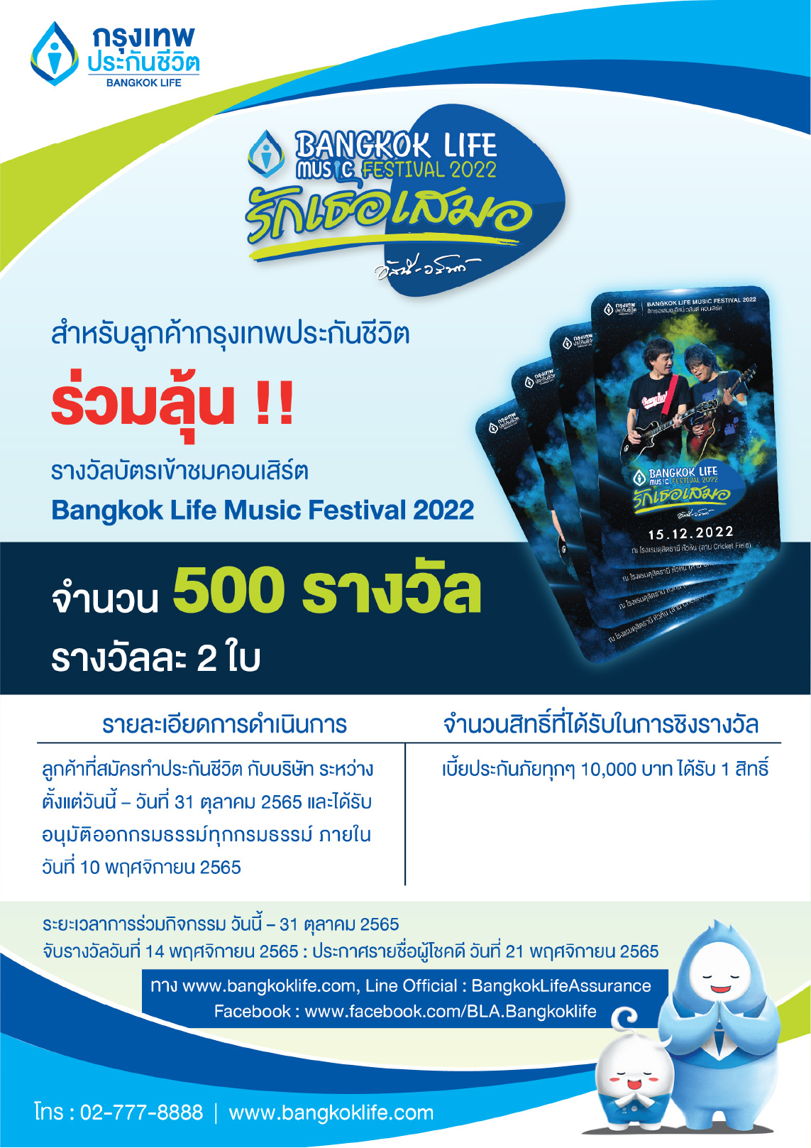 ทั้งนี้ สิทธิพิเศษสำหรับลูกค้าที่สมัครทำประกันชีวิตกับ บริษัท กรุงเทพประกันชีวิต จำกัด (มหาชน) ตั้งแต่วันนี้ จนถึงวันที่ 31 ตุลาคม 2565 สำหรับเบี้ยประกันภัยทุก ๆ 10,000 บาท ภายในเงื่อนไขที่กำหนด จะได้รับ 1 สิทธิ์ ในการร่วมลุ้นรางวัลพิเศษ บัตรเข้าชมคอนเสิร์ต Bangkok Life Music Festival 202 คอนเสิร์ต อัสนี-วสันต์ “รักเธอเสมอ” จำนวน 2 ใบ รวม 500 รางวัล โดยบริษัทจะทำการจับรางวัลในวันที่ 14 พฤศจิกายน 2565 และประกาศรายชื่อผู้โชคดี ในวันที่ 21 พฤศจิกายน 2565