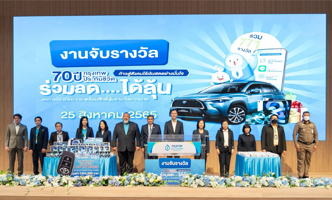 กรุงเทพประกันชีวิต นำโดย นายโชน โสภณพนิช (ที่ 6 จากขวา) กรรมการผู้จัดการใหญ่และประธานเจ้าหน้าที่บริหาร พร้อมคณะผู้บริหาร และผู้ทรงคุณวุฒิ นางพจณี คงคาลัย (ที่ 5 จากขวา) และ นางสาวพรพิมล ตรงเที่ยงธรรม (ที่ 4 จากขวา) ผู้ช่วยผู้จัดการใหญ่ ธนาคารกรุงเทพ จำกัด (มหาชน) นางสาวอัจฉรา ผ่องผล (ที่ 3 จากขวา) บรรณาธิการบริหาร วารสารการเงินธนาคาร นายณัฐวัฒน์ วงศ์บัณฑิต (ที่ 2 จากขวา) เจ้าหน้าที่จากสำนักการสอบสวนและนิติการ กรมการปกครอง และพันตำรวจโท บรรเจิด พวงสมบัติ (ขวาสุด) สวป.สน.ประชาชื่น ร่วมเป็นสักขีพยานในงานจับรางวัลแคมเปญสุดพิเศษ “70 ปี กรุงเทพประกันชีวิต ร่วมลด...ได้ลุ้น” โดยมอบรางวัลแก่ผู้โชคดี จำนวน 771 รางวัล จากการทำธุรกรรมผ่านระบบออนไลน์ของบริษัทที่ร่วมรายการ ซึ่งจัดขึ้นระหว่างวันที่ 1 กันยายน 2564 – 15 สิงหาคม 2565 ที่ผ่านมา โดยรางวัลจากกิจกรรมดังกล่าว ได้แก่ รถยนต์ Toyota Cross, iPad Air และบัตรกำนัล รวมมูลค่ากว่า 3.8 ล้านบาท