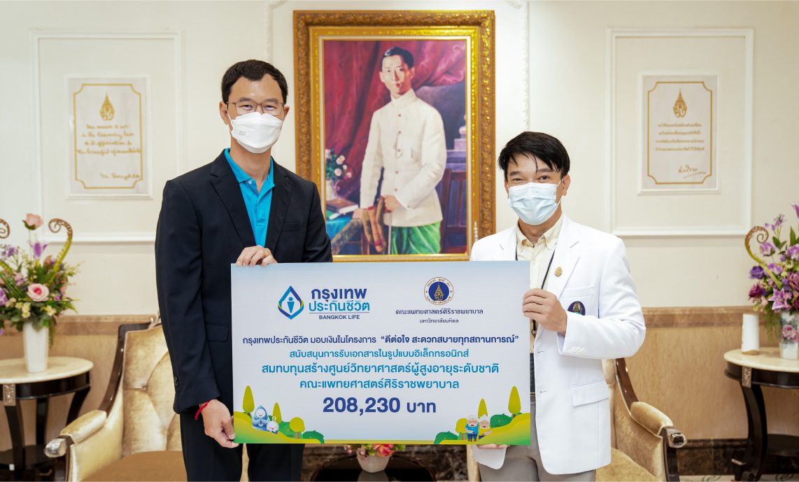 กรุงเทพประกันชีวิต รณรงค์ลดการใช้ทรัพยากร ส่งเสริมให้ผู้เอาประกันรับเอกสารในรูปแบบอิเล็กทรอนิกส์ พร้อมมอบความสุขสู่สังคมผ่านโครงการ “ดีต่อใจ...สะดวกสบายทุกสถานการณ์” ตั้งแต่ 1 กรกฎาคม 2563 - 30 กันยายน 2564 โดยมอบเงินสมทบทุนสำหรับทุกการสมัครรับเอกสารแบบอิเล็กทรอนิกส์ในระยะเวลาของโครงการ จำนวน 208,230 บาท สนับสนุนการสร้างศูนย์วิทยาศาสตร์ผู้สูงอายุระดับชาติ คณะแพทย์ศาสตร์ศิริราชพยาบาล เพื่อเป็นศูนย์ศึกษาและผลิตงานวิจัยตลอดจนส่งเสริมสุขภาพและดูแลผู้ป่วยสูงอายุให้มีคุณภาพชีวิตที่ดีอย่างยั่งยืน เมื่อเร็ว ๆ นี้