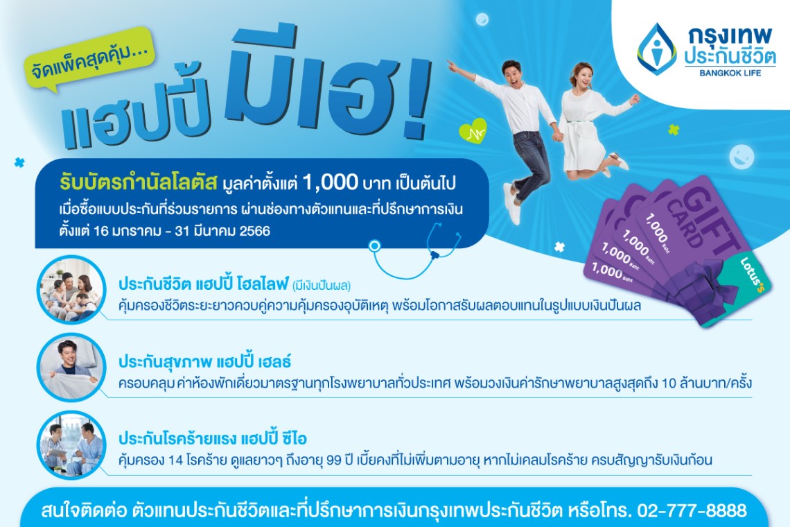 เพื่อส่งเสริมให้คนไทยได้เริ่มเตรียมความพร้อมในการใช้ชีวิตที่มั่นคงและมีความสุขในสังคมอายุยืน กรุงเทพประกันชีวิตจึงมอบโปรโมชั่นสุดพิเศษ ด้วยแพ็คเกจสุดคุ้ม “แฮปปี้ มีเฮ” เมื่อซื้อประกันชีวิต “แฮปปี้ โฮลไลฟ์ (มีเงินปันผล)” คู่กับ สัญญาเพิ่มเติมสุขภาพ “บีแอลเอ แฮปปี้ เฮลธ์” และ/หรือ สัญญาเพิ่มเติมโรคร้ายแรง “แฮปปี้ ซีไอ” ผ่านช่องทางตัวแทนประกันชีวิตและที่ปรึกษาการเงิน และดาวน์โหลดพร้อมลงทะเบียนใช้งานแอปพลิเคชัน BLA Happy Life ตั้งแต่วันที่ 16 มกราคม ถึง 31 มีนาคม 2566 รับบัตรของขวัญโลตัส มูลค่าตั้งแต่ 1,000 บาท เป็นต้นไป สำหรับเบี้ยประกันภัยปีแรกแบบรายปี ตั้งแต่ 30,000 บาท เป็นต้นไป และพิเศษสำหรับเบี้ยประกันภัยที่เพิ่มขึ้น ทุก ๆ 100,000 บาท รับเพิ่ม บัตรของขวัญโลตัส มูลค่า 5,000 บาท สามารถดูรายละเอียดเพิ่มเติมได้ที่ https://bit.ly/Pro-HappyPack