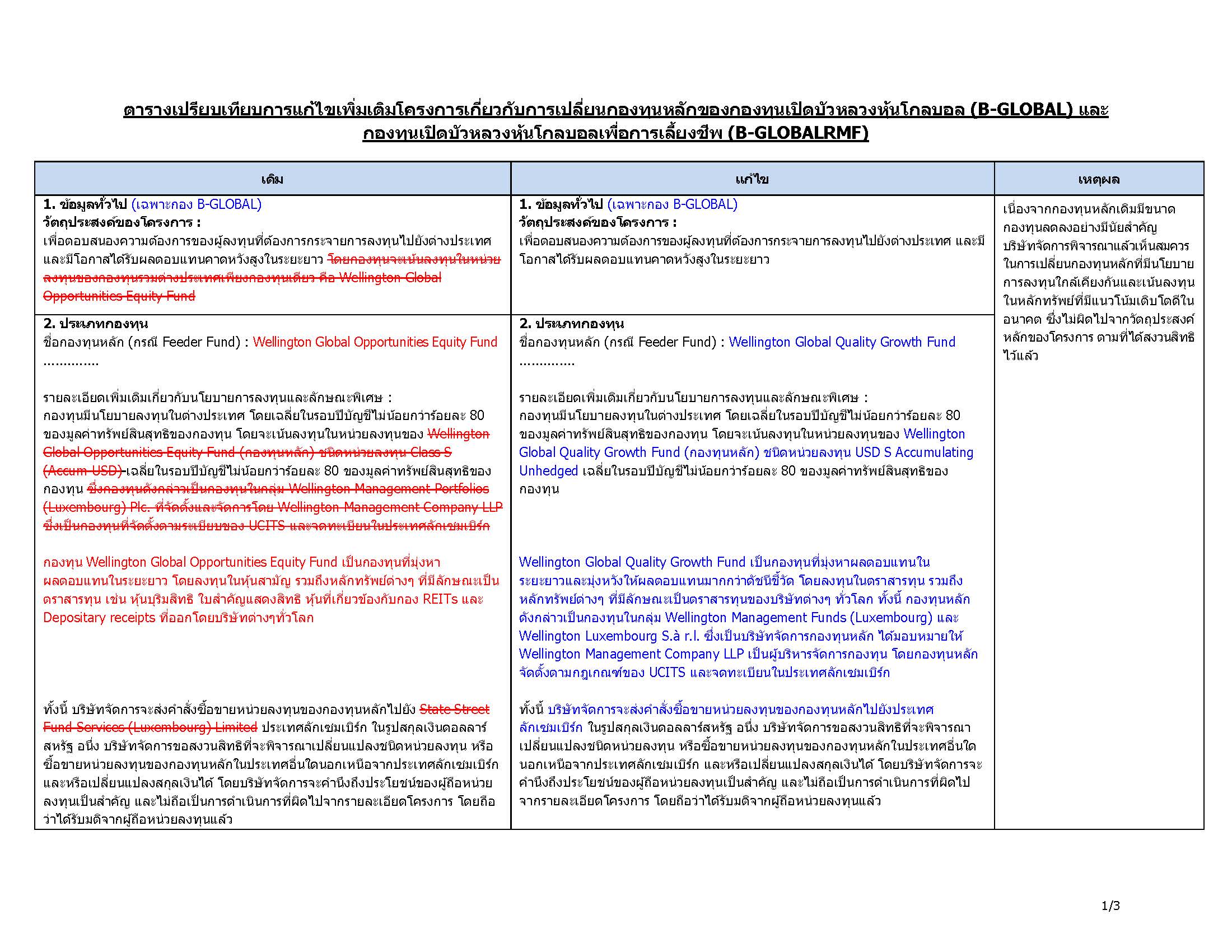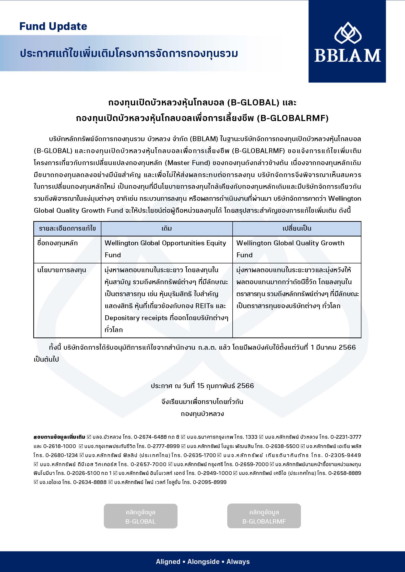 ดาวน์โหลด ประกาศ เรื่องการเปลี่ยนแปลงกองทุนหลัก (Master Fund) สำหรับกองทุน B-Global และ B-GlobalRMF