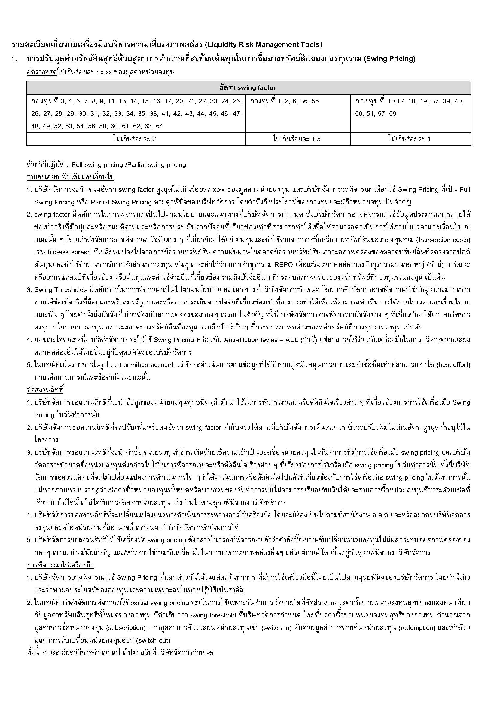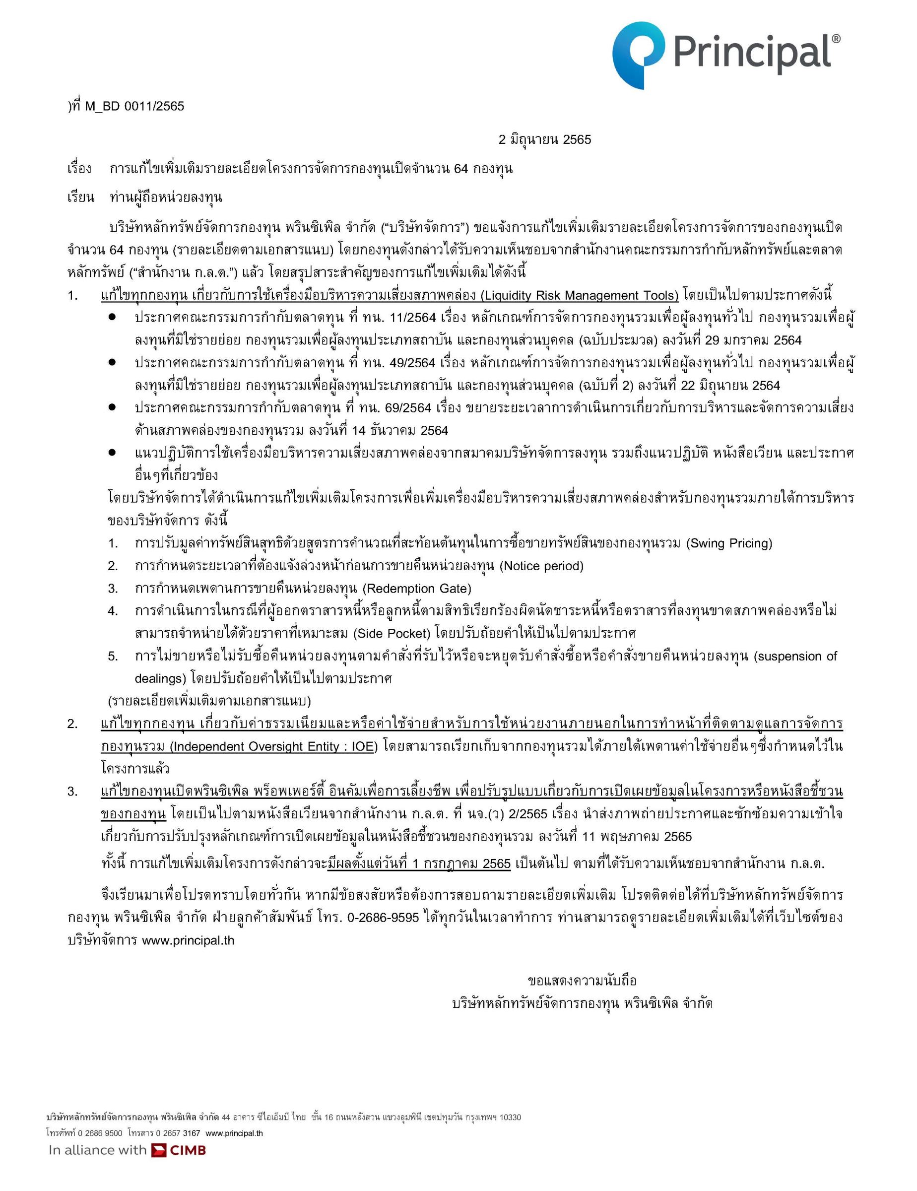ประกาศ เรื่องการใช้เครื่องมือบริหารความเสี่ยงสภาพคล่อง (Liquidity Management Tools) โดยบริษัทหลักทรัพย์จัดการกองทุน พรินซิเพิล จำกัด