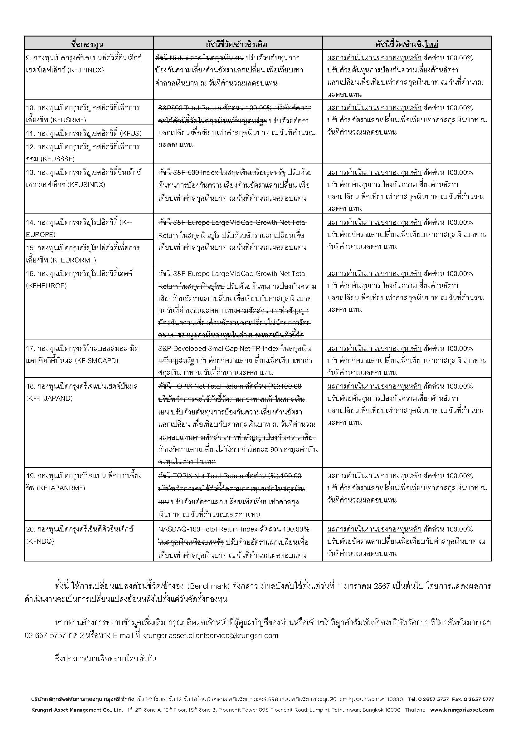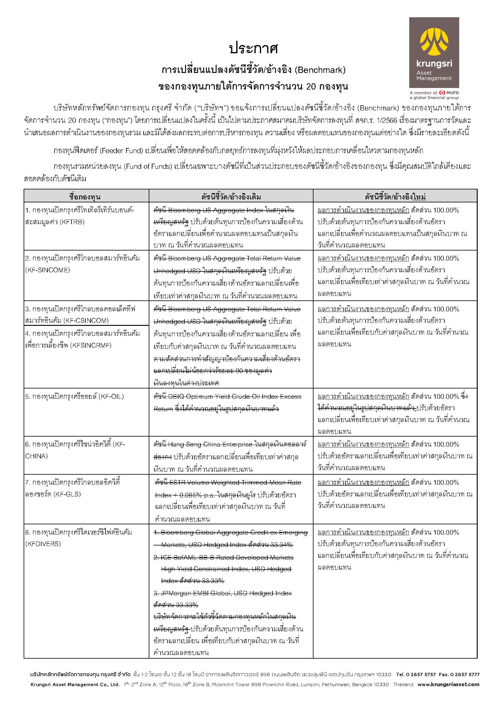 ประกาศเรื่อง การเปลี่ยนแปลงดัชนีชี้วัด/อ้างอิง (Benchmark) ของกองทุนภายใต้การจัดการจำนวน 20 กองทุน โดยบริษัทหลักทรัพย์จัดการกองทุน กรุงศรี จำกัด