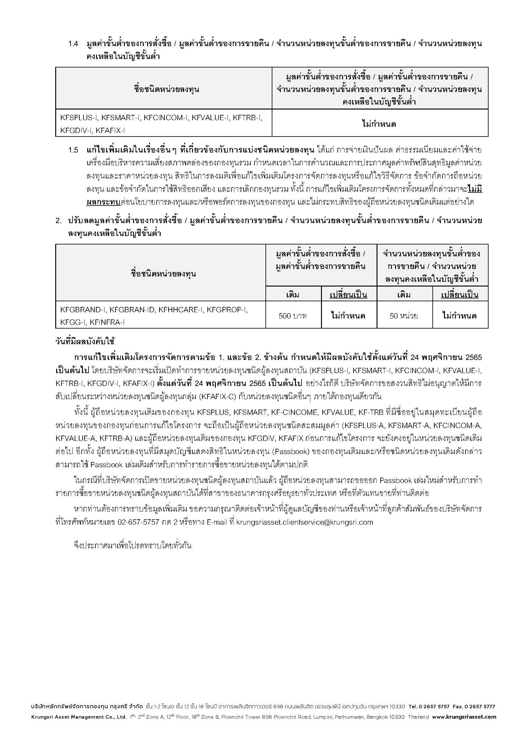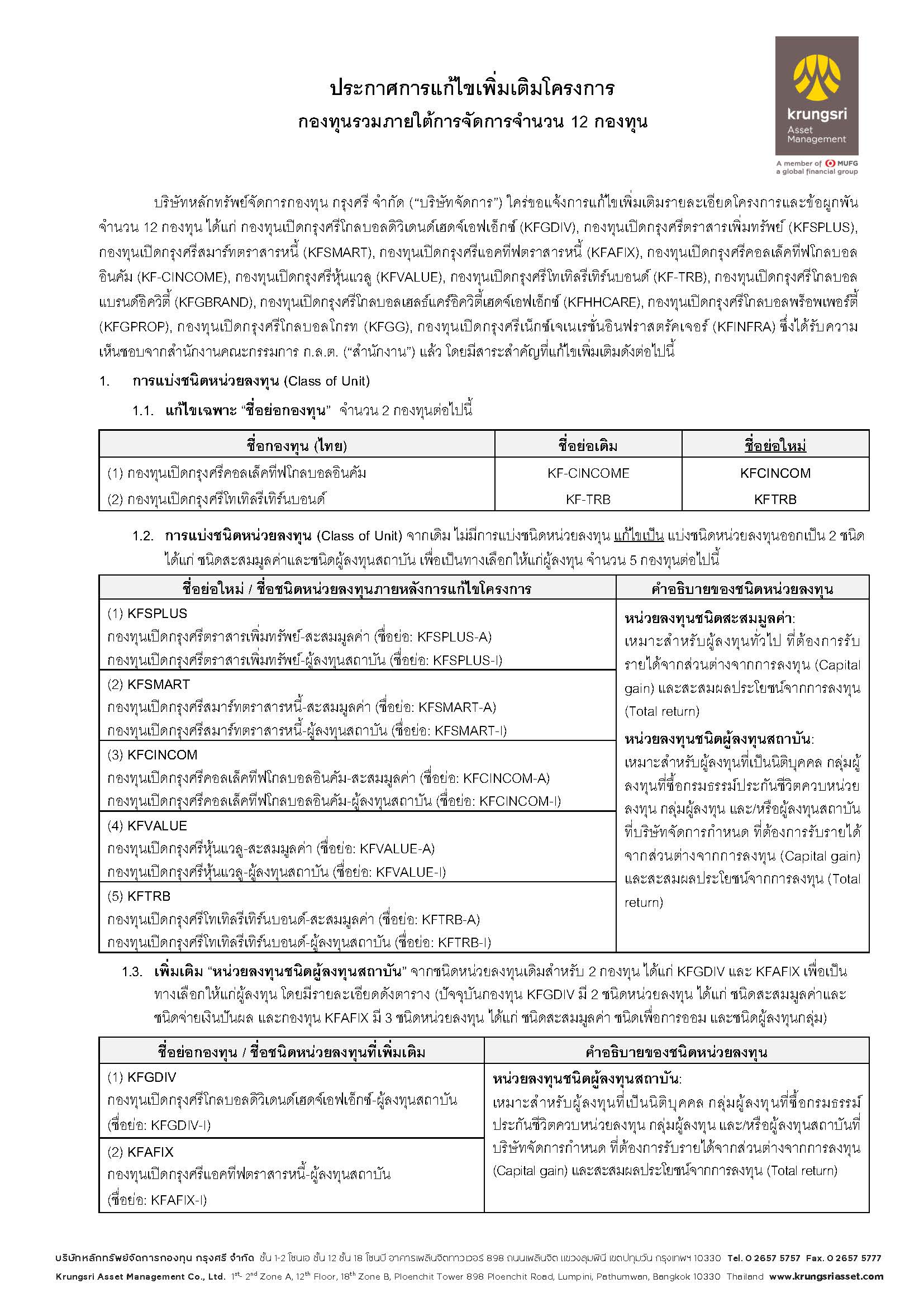 ดาวน์โหลด ประกาศ เรื่องการเปลี่ยนแปลงชื่อกองทุนและเพิ่มชนิดหน่วยลงทุนโดยบริษัทหลักทรัพย์จัดการกองทุน กรุงศรี จำกัด