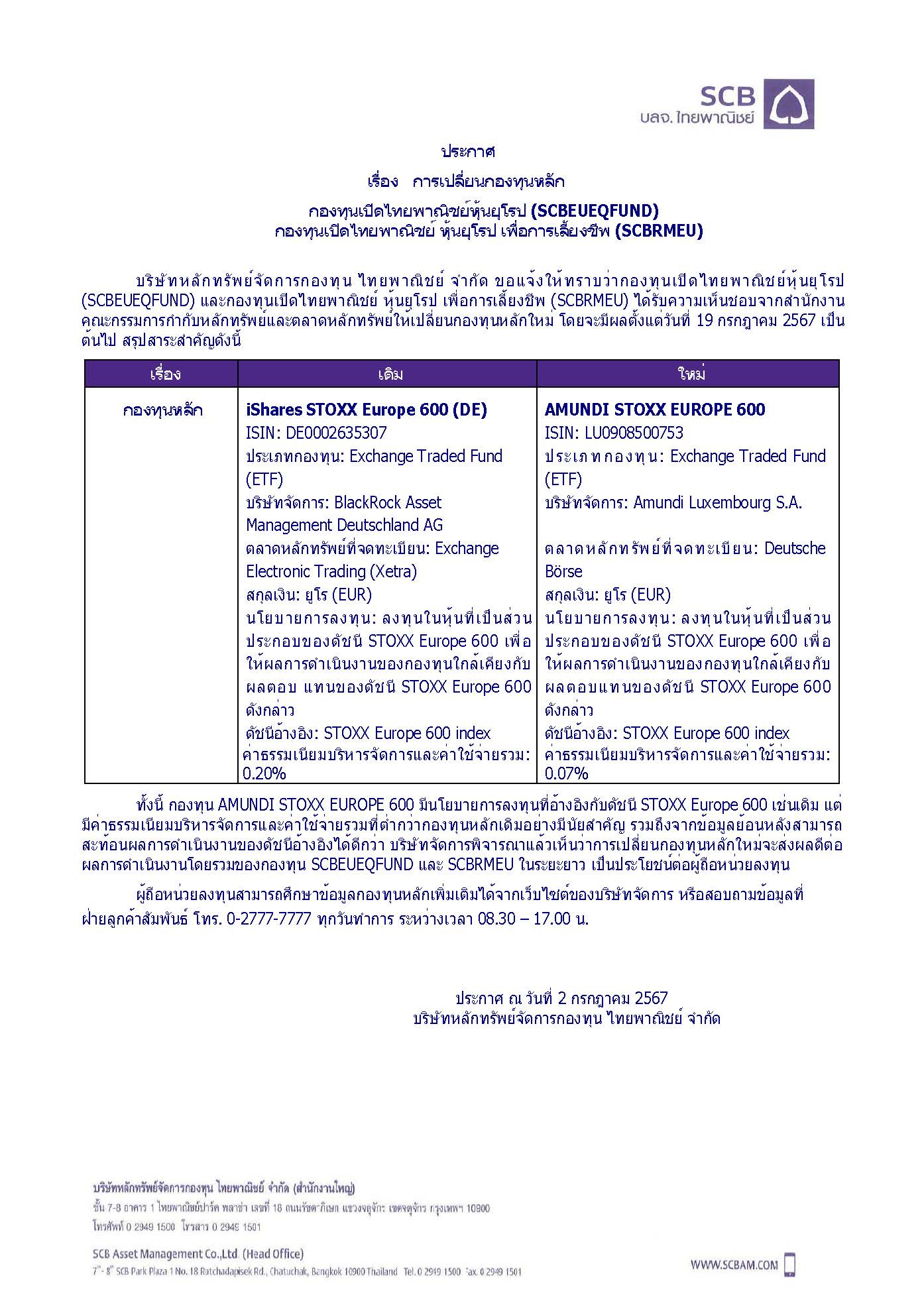 ประกาศเรื่อง การเปลี่ยนแปลงกองทุนหลักสำหรับ กองทุนเปิดไทยพาณิชย์หุ้นยุโรป ชนิดสะสมมูลค่า (SCBEUEQA)