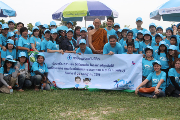 นำโดยคุณฉันทนา วิมุกตานนท์ ผู้ช่วยผู้จัดการใหญ่ สายประกันชีวิต พร้อมด้วยผู้บริหาร พนักงาน และฝ่ายขาย ร่วมกันทำกิจกรรมเพื่อสังคม ด้วยการปลูกต้นไม้ยืนต้น อาทิ ต้นราชพฤกษ์ ต้นหางนกยูง ต้นคูณ ณ โรงเรียนปลูกรากแก้วแผ่นดินและธรรมสถาน อ.ชะอำ จ.เพชรบุรี อันเป็นการสร้างธรรมสถานให้ร่มรื่นเพื่อใช้ในการปฏิบัติธรรมของสามเณร และ พุทธศาสนิกชน และถวายเป็นพุทธบูชาแก่พระพุทธศาสนาให้คงอยู่สืบไป