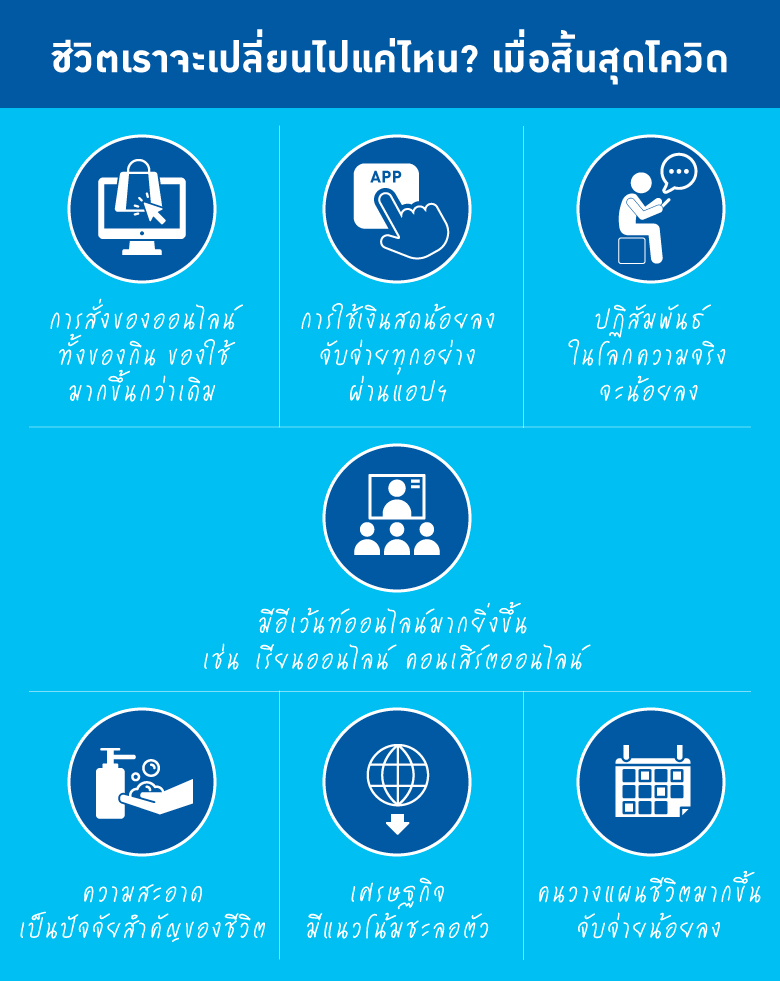 มีนักวิชาการหลายคนเปรียบเทียบว่า ถ้าโควิด-19 หยุดการระบาด จะเทียบเท่ายุคหลังสงครามโลกครั้งที่ 2 และยุคหลังสงครามเย็นเลยทีเดียว เพราะวิถีชีวิตของคนทั้งโลกจะเปลี่ยนไปจากเดิมอย่างแน่นอน เราลองมาดูกันเล่นๆ ว่าจะมีอะไรจะเปลี่ยนแปลงไปบ้างหลังจากนี้