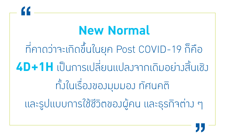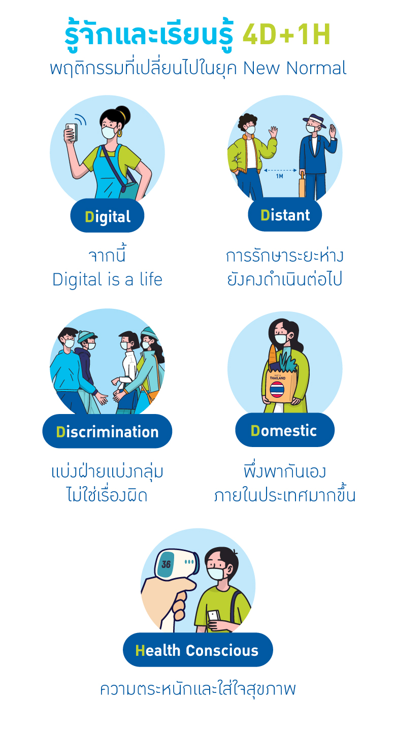เชื่อว่าตอนนี้คงไม่มีใครไม่รู้จักคำว่า "New Normal" หรือที่แปลเป็นไทยก็คือ "ความปกติรูปแบบใหม่" ที่เข้ามาเปลี่ยนรูปแบบการใช้ชีวิตของเราทุกคน สิ่งที่เคยเป็นเรื่องแปลก และไม่คิดว่าจะเกิดขึ้นจริง ก็เกิดขึ้นแล้วในห้วงเวลานี้ โดยมีทฤษฎีที่ทำนายทายทักว่าจะมีพฤติกรรมที่เปลี่ยนไปหลังจากนี้คือ 4D+1H แล้วมีอะไรที่เราต้องเริ่มเรียนรู้ เพื่อปรับตัวให้เข้าสู่สังคมยุคใหม่ที่กำลังจะเกิดขึ้นในไม่ช้า เราจะมาหาคำตอบไปพร้อม ๆ กัน