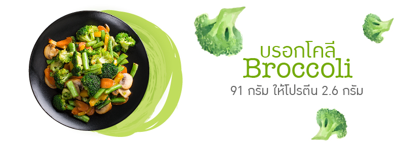 1. ผัดบรอกโคลีเห็ดหอม (บรอกโคลีดิบ 91 กรัม ให้โปรตีน 2.6 กรัม)