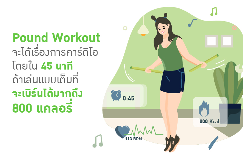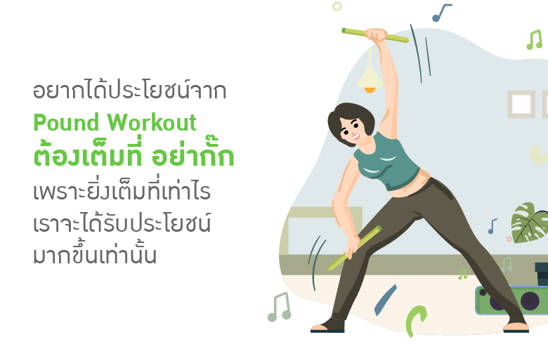 Pound Workout คืออะไร ?Pound Workout คือการออกกำลังกายที่ผสมผสานระหว่างการ Cardio และ Weight Training โดยเน้นไปทาง Pilates ท่าที่ถูกออกแบบมาจะช่วยให้เราได้บริหารกล้ามเนื้อขา สะโพก แกนกลางลำตัว และหลัง และจะมีอุปกรณ์ที่มีลักษณะคล้ายไม้ตีกลอง เรียกว่า “Ripstix” เอาไว้เคาะจังหวะขณะที่เราออกกำลังกาย การใช้ Ripstix จะช่วยให้เราได้บริหารกล้ามเนื้อแขน อก และหัวไหล่