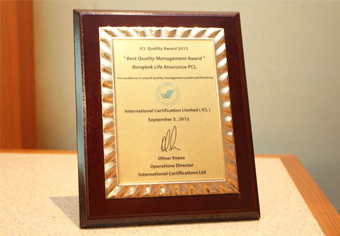 The Bangkok Life Assurance (Public) Company Limited is the first life insurance company to be awarded the ISO 9001:2008 certification of the International Certification Ltd., Auckland New Zealand (ICL) for the operation of life, branch and group insurance. It then received the Best Quality Management Awards 2012 for having consistently maintained the ISO 9001 quality standard for over 9 years. Every employee is prepared…..for service, prepared….to greet customers, honestly and sincerely, and to extend its up-to-standard service to all branches in the future. At present, the Company has extended its quality management standard through branches that have achieved this quality standard, totaling over 30 branches in every region.