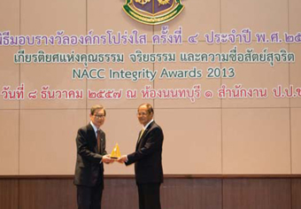 Bangkok Life Assurance PLC was awarded a consolation prize for Transparency at the 4th Annual NACC Integrity Awards 2013, as the only insurance company to be honoured with this award. The selection criterias include corporate policies and good governance operations, transparency, ethics and morale in the business practice. The Company aims to serve and strengthen financial services to the public and organisation, building protection and wealth as well as enhancing happiness of society in different areas.
