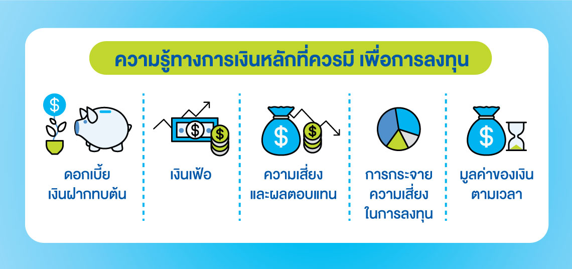 “ความรู้ทางการเงิน” เรื่องที่คนไทยมีค่าเฉลี่ยที่ต่ำ ได้แก่ ความรู้เรื่องดอกเบี้ยเงินฝากทบต้น เงินเฟ้อ ความเสี่ยงและผลตอบแทน การกระจายความเสี่ยงในการลงทุน และมูลค่าของเงินตามเวลา ซึ่งเป็นความรู้หลักสำหรับการลงทุน
