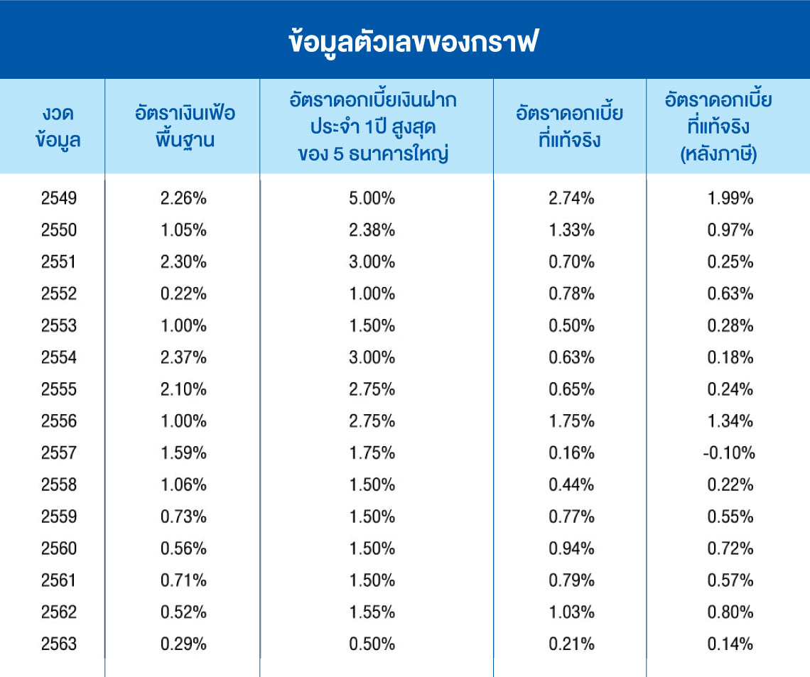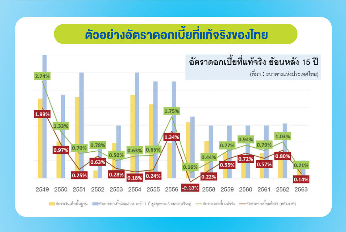 จะเห็นได้ว่าในช่วง 15 ปีที่ผ่านมา “อัตราดอกเบี้ยแท้จริง” ของเงินฝากธนาคารไทยส่วนมากอยู่ต่ำกว่า 1% และหากต้องถูกหักภาษี 15% จากดอกเบี้ยที่ได้รับ ในบางปีเราแทบไม่สามารถคงค่าของเงินต้นที่มีอยู่จากการที่มีผลตอบแทนจริงต่ำกว่าอัตราเงินเฟ้อ การฝากเงินธนาคารจึงอาจเป็นการออมที่ไม่ได้ช่วยเพิ่มมูลค่าของเงินในด้านการลงทุนมากนัก