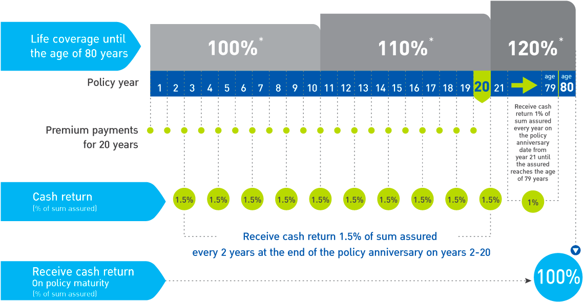 - Receive 1% of sum assured every year on the policy anniversary date from year 21 until the policy anniversary date which the assured reaches the age of 79 years