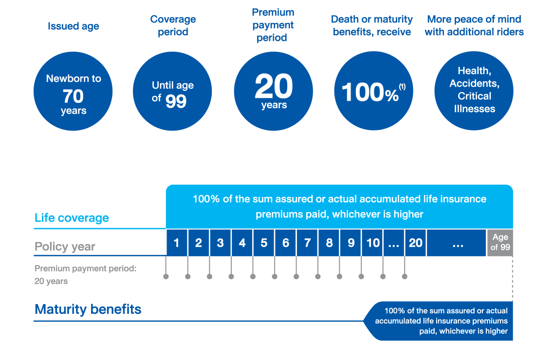 On the maturity date, receive 100% cash return of the sum assured or actual accumulated life insurance premiums paid, whichever is higher