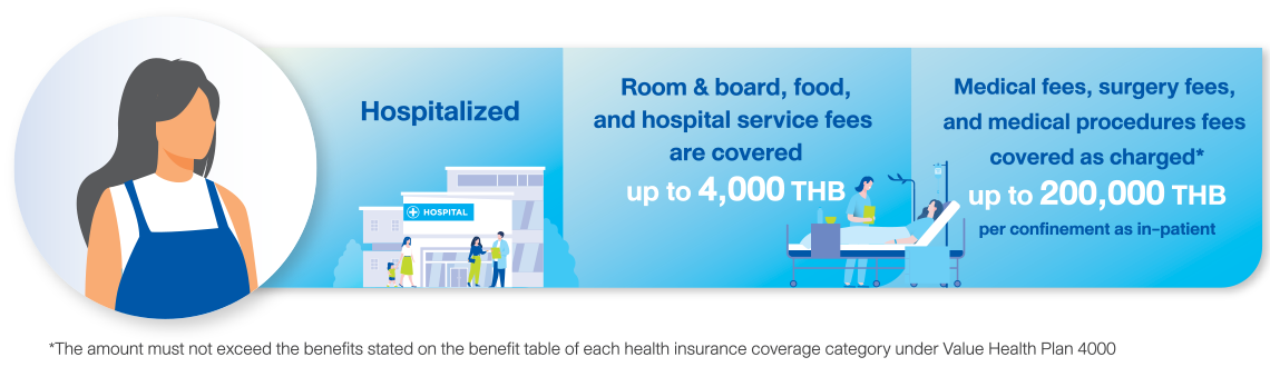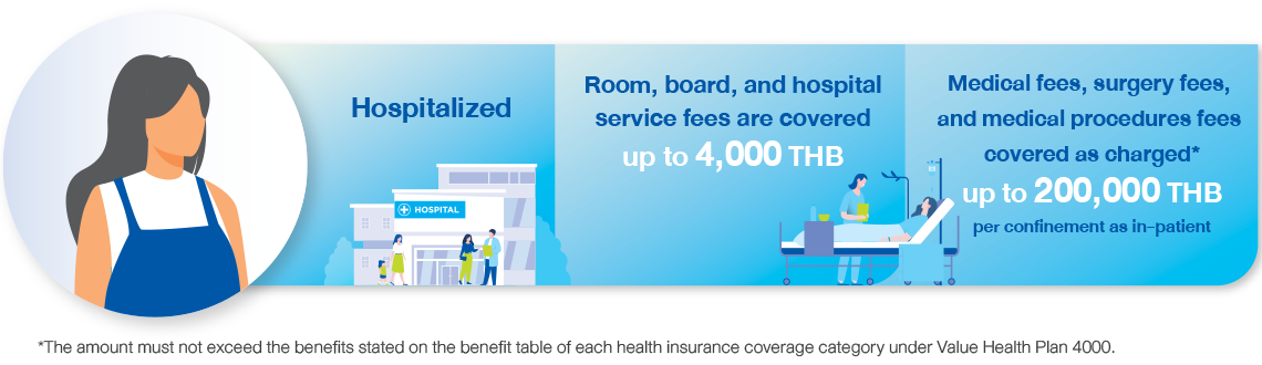 | Group 2 | Fees for medical service, diagnosis, treatment, blood services, nurse services, medicine, intravenous nutrient, and medical supplies, per confinement | Must not exceed 25,000 with all Group 2 benefits combined | Must not exceed 30,000 with all Group 2 benefits combined | Must not exceed 200,000 with all Group 2 and Subgroup 4.1-4.4 benefits combined | Must not exceed 400,000 with all Group 2 and Subgroup 4.1-4.4 benefits combined |