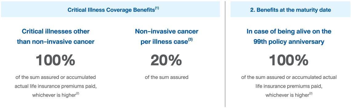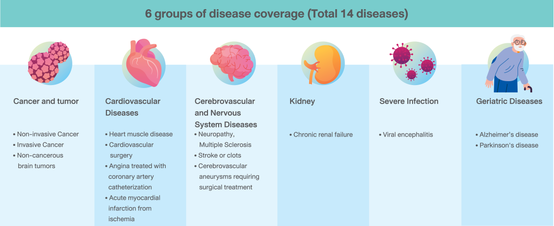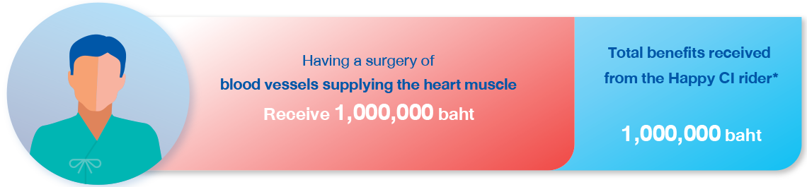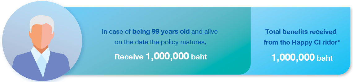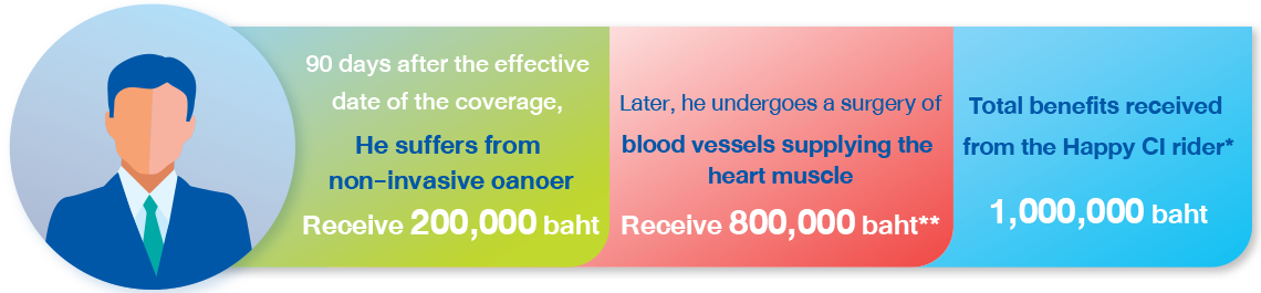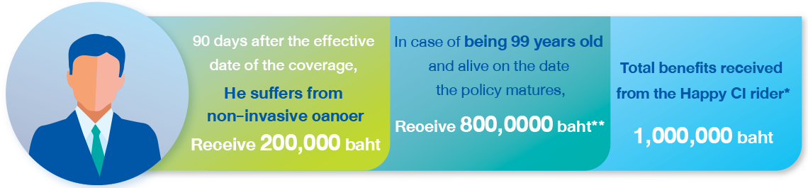 (1) Waiting Period of Happy CI rider is 90 days from the rider’s effective date. The company will pay the benefit if the insured is diagnosed and/or confirmed by a doctor while the insured is alive as having one of the 14 covered critical illnesses. The total critical illness benefit must not exceed 100% of the sum assured or the accumulated premiums paid for the rider, whichever is higher. In case that the total benefit paid is equal to the sum assured or the accumulated premiums paid for the rider, whichever is higher, the rider will be automatically terminated. Moreover, if the insured dies during the benefit payment process for benefit item 1.1 and/or 1.2, the company will pay the benefit to the beneficiary.