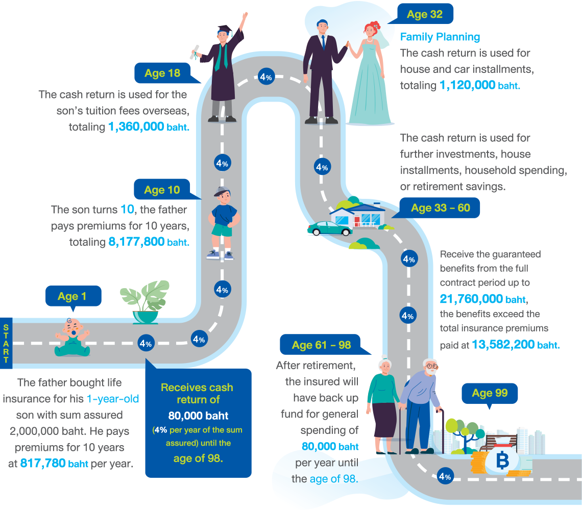 Example: A father wants to save money for his 1-year-old son's tuition, he would love BLA Happy Saving 99/10 (Par), which has an insurance period of 99 years and a premium payment period of ten years. Yearly sum assured: 2,000,000 Thai baht; Annual Premium Payment: 817,780 Thai baht.