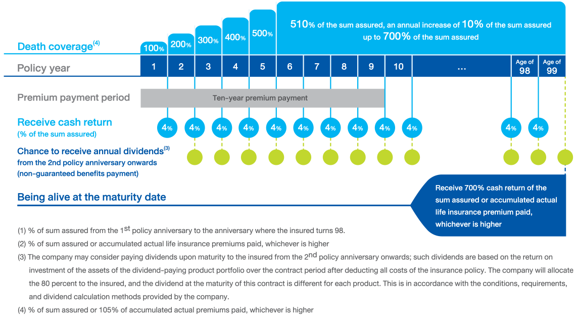 Receive cash return starting from the complete of the 1st policy anniversary to the policy year that the insured turns 98 years old, 4% per year of the sum assured + Chance to receive returns from dividends(1)