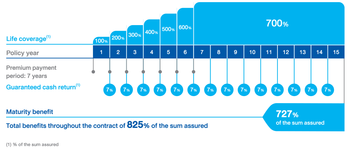 On the 1st - 14th policy anniversary, receive 7% cash return