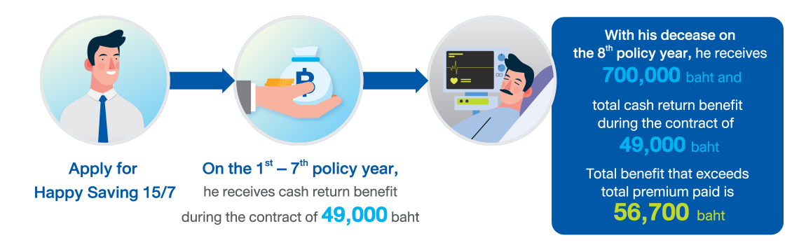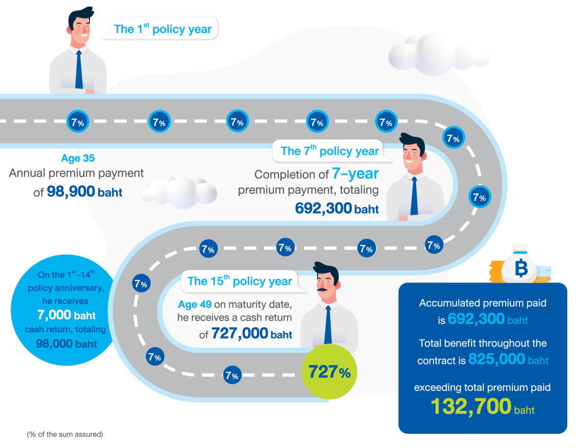 Example A 35-year-old male in good health would like to purchase a Happy Saving 15/7 with a coverage period of 15 years and premium payment period of 7 years. His sum assured is 100,000 baht. He pays an annual premium of 98,900 baht and has a personal income tax rate of 20 percent throughout the contract period.
