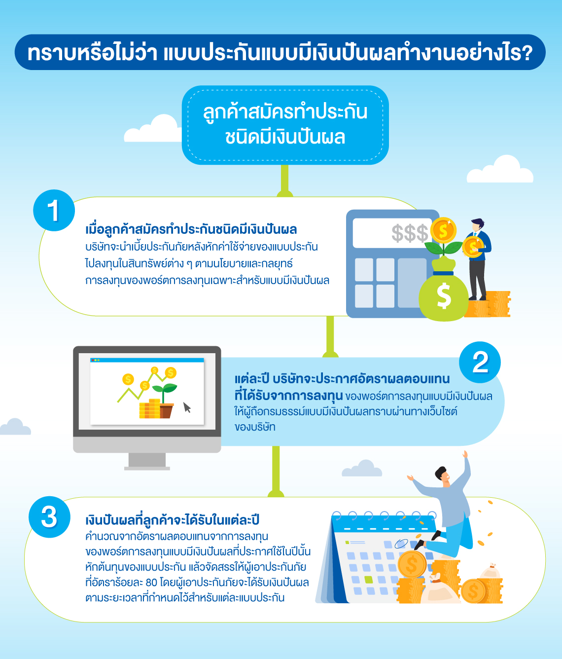สำหรับเงินปันผลที่ลูกค้าจะได้รับในแต่ละปี จะคำนวณจากอัตราผลตอบแทนจากการลงทุนของพอร์ตการลงทุนแบบมีเงินปันผลที่ประกาศใช้ในปีนั้น หักต้นทุนของแบบประกัน จากนั้นจึงจัดสรรให้ผู้เอาประกันภัยที่อัตราร้อยละ 80 โดยผู้เอาประกันภัยจะได้รับเงินปันผลตามระยะเวลาที่กำหนดไว้สำหรับแต่ละแบบประกัน