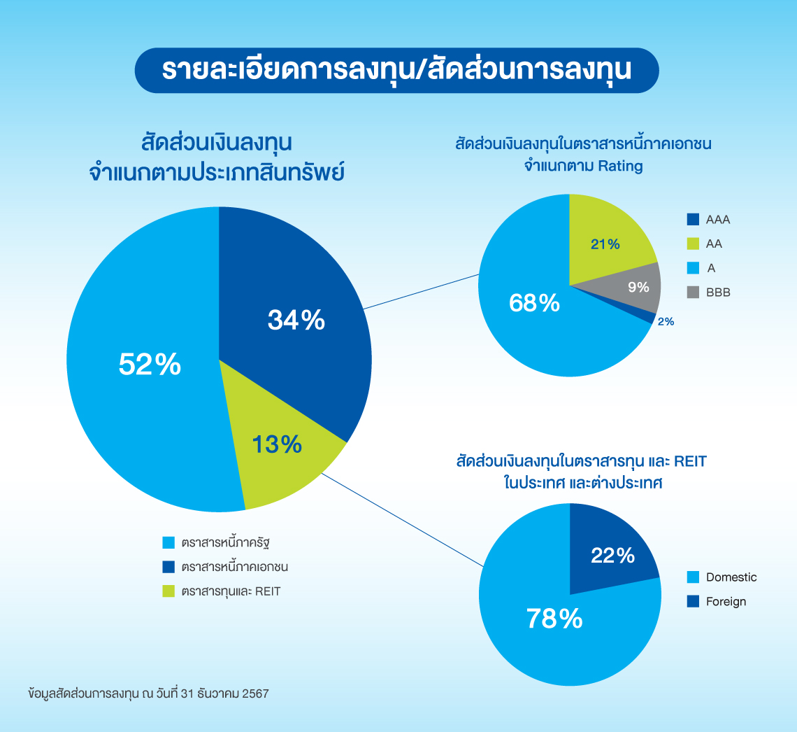 นโยบายการจัดสรรเงินลงทุนจะเน้นการลงทุนในตราสารหนี้ภาครัฐและภาคเอกชนเป็นสัดส่วนประมาณร้อยละ 80 ของพอร์ทการลงทุน และอีกร้อยละ 20 จะลงทุนในสินทรัพย์ทางการเงินที่มีความเสี่ยงสูงขึ้นเช่นหุ้นสามัญ และ REIT ทั้งในประเทศและต่างประเทศ เพื่อเพิ่มโอกาสในการได้รับผลตอบแทนที่สูงขึ้น