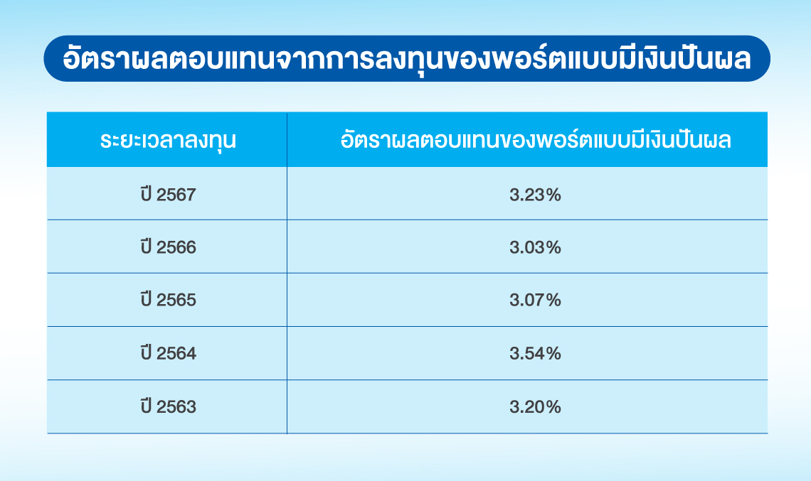 - อัตราผลตอบแทนจากการลงทุน คำนวณจากผลรวมของดอกเบี้ยรับ เงินปันผลรับ และกำไร/ขาดทุน จากการจำหน่ายเงินลงทุน หารด้วยสินทรัพย์ลงทุนเฉลี่ยของกลุ่มผลิตภัณฑ์แบบมีส่วนร่วมในเงินปันผลในรอบปี