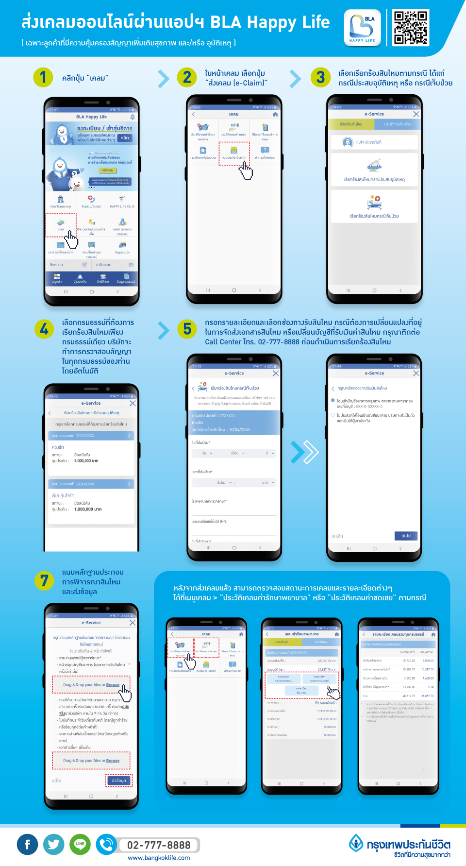 - หากเข้ารักษาที่รพ. ทั่วไป ที่ไม่ใช่คู่สัญญา : สามารถแจ้งตัวแทนของท่านเพื่อช่วยดูแลประสานงาน หรือส่งเคลมด้วยตัวเองได้ง่าย ๆ ผ่านแอปพลิเคชั่น BLA Happy Life พร้อมตรวจสอบสถานะการเคลม และดูประวัติการเคลมย้อนหลังได้อีกด้วย ดูวิธีการใช้งานตามขั้นตอนในภาพที่นำมาฝากกันได้เลยครับ