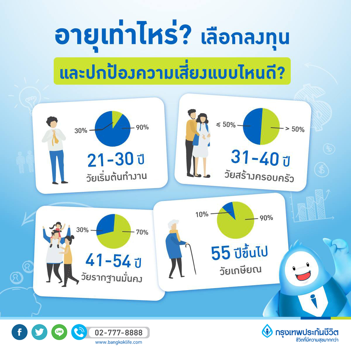 หนึ่งในคำถามที่หลาย ๆ คนสงสัยคือ ช่วงอายุเท่านี้ ควรเก็บเงิน - ลงทุน - ปกป้องความเสี่ยงแบบไหน? จะแบ่งสัดส่วนในพอร์ตอย่างไร? จริงๆ แล้ว วิธีที่เหมาะสมสำหรับแต่ละคนอาจจะไม่เหมือนกัน ขึ้นอยู่กับหลากหลายปัจจัย ไม่ว่าจะเป็นความเชี่ยวชาญ ภาระหน้าที่ เป้าหมาย ระดับความเสี่ยงที่ยอมรับได้ ฯลฯ