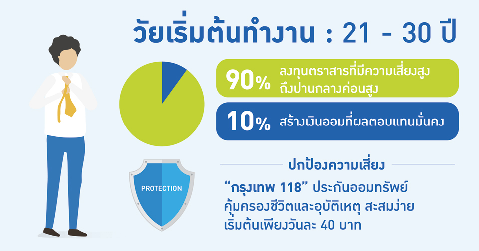 ช่วงวัยนี้ นับว่าได้เปรียบในการออมและการลงทุนมากที่สุด เพราะยังไม่ค่อยมีภาระให้รับผิดชอบมากนัก มีเวลาและกำลังในการหารายได้