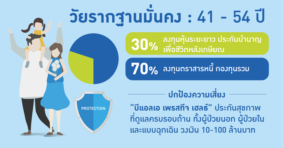 วัยนี้มีความมั่นคงที่สุด ชีวิตเริ่มลงตัว ด้วยฐานเงินเดือนที่สูงขึ้น แต่ภาระยังคงมีอยู่ และที่สำคัญคือหากคุณเป็นมนุษย์เงินเดือน...จะเหลือเวลาที่จะสร้างรายได้อีกไม่มาก จึงควรให้ความสำคัญกับการบริหารจัดการการเงินเพื่ออนาคต