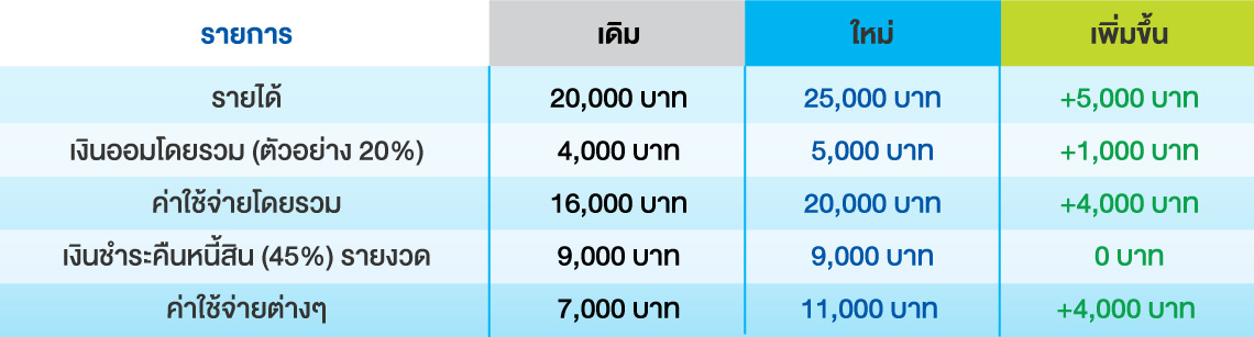 ผลของเงินชำระหนี้ที่เพิ่มขึ้นจาก 9,000 บาท เป็น 11,250 บาท หากมีหนี้สินเงินกู้บ้านคงเหลือ 1,200,000 บาท อัตราดอกเบี้ยเงินกู้ 5% ระยะเวลาที่เราต้องผ่อนชำระจากเดิมคงเหลือประมาณ 21 ปี จะลดลงเหลือประมาณ 13 ปีเท่านั้น เมื่อ “มีเงินเพิ่มขึ้น” สม่ำเสมอ...แน่นอนก่อนจะนำไปใช้เราควรสร้าง “การออม” และ “ชำระหนี้สิน” ก่อนนำไปใช้ รวมถึงการทบทวนและปรับเป้าหมายทางการเงินต่างๆ โดยเฉพาะเป้าหมายการเงินเพื่อการเกษียณอายุ เป็นเรื่องที่ควรทำเมื่อเรามีรายได้ที่เปลี่ยนแปลงไป เนื่องจากคนส่วนใหญ่มักต้องการมีคุณภาพชีวิตในช่วงหลังเกษียณที่ไม่แตกต่างจากคุณภาพชีวิตในช่วงก่อนเกษียณ เป้าหมายจึงควรทบทวนเมื่อเรามีรายได้เพิ่มขึ้นอีกด้วย เพียงเท่านี้เราก็จะสบายใจได้ว่าเงินที่เรานำไปใช้จ่ายเพิ่มเติมจะยังคง “สร้างความมั่นคงทางการเงิน” ในระยะยาวให้กับเรา