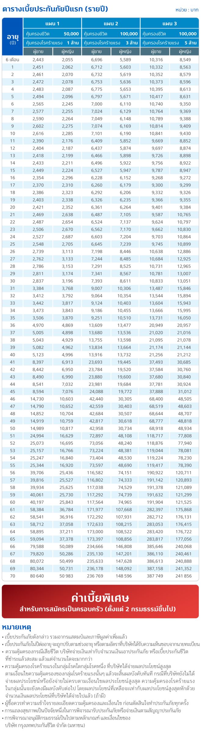 - อัตราเบี้ยประกันภัย ขึ้นอยู่กับอายุ และเพศของผู้เอาประกันภัย
