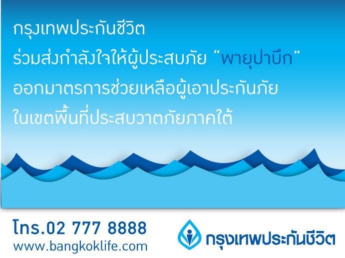 ม.ล.จิรเศรษฐ ศุขสวัสดิ์ กรรมการผู้จัดการใหญ่และประธานเจ้าหน้าที่บริหาร บริษัท กรุงเทพประกันชีวิต จำกัด (มหาชน) ขอร่วมส่งกำลังใจแก่ผู้ประสบภัยและประชาชนที่ได้รับผลกระทบจากเหตุการณ์พายุ “ปาบึก” ในภาคใต้ เพื่อช่วยบรรเทาความเดือดร้อนดังกล่าว บริษัทจึงได้ออกมาตรการช่วยเหลือผู้เอาประกันที่อยู่ในพื้นที่จังหวัดเพชรบุรี ประจวบคีรีขันธ์ ชุมพร สุราษฎร์ธานี นครศรีธรรมราช พัทลุง สงขลา ปัตตานี ยะลา นราธิวาส ระนอง พังงา ภูเก็ต กระบี่ ตรัง และสตูล โดยผู้เอาประกันภัยที่มีสัญญาสุขภาพของกรุงเทพประกันชีวิตสามารถเข้ารับบริการในโรงพยาบาลคู่สัญญาเพียงยื่นบัตรประชาชน ทั้งนี้บริษัทพิจารณาอนุโลมค่าธรรมเนียมการชำระเบี้ยประกันภัยล่าช้า ค่าธรรมเนียมการออกกรมธรรม์ใหม่ เนื่องจากชำรุดหรือสูญหาย ให้แก่ผู้เอาประกันที่อยู่ในพื้นที่ประสบภัย โดยพิจารณาตามกรณีที่เกิดขึ้นจริง ผู้ประสบภัยสามารถติดต่อขอคำแนะนำด้านการแพทย์ทางโทรศัพท์ และข้อมูลเกี่ยวกับสถานพยาบาล ได้ที่บริการผู้ช่วยส่วนบุคคล (BLA Assistance Line) ที่เบอร์ 02-777-8989 และสามารถสอบถามรายละเอียดเพิ่มเติมเกี่ยวกับกรมธรรม์และความคุ้มครองได้ที่ โทร. 02-777-8888