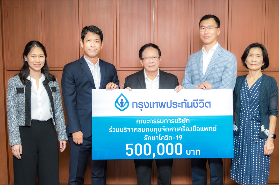 ดร.ศิริ การเจริญดี (กลาง) ประธานกรรมการ พร้อมคณะกรรมการและผู้บริหารของบริษัท กรุงเทพประกันชีวิต จำกัด (มหาชน) นำเงินบริจาคของคณะกรรมการบริษัทฯ จำนวน 500,000 บาท มอบให้แก่มูลนิธิรามาธิบดี และโรงพยาบาลธรรมศาสตร์เฉลิมพระเกียรติ เพื่อใช้ในการสนับสนุนการดูแลรักษาผู้ป่วยติดเชื้อโควิด-19 พร้อมส่งกำลังใจให้บุคลากรทางการแพทย์ที่เป็นด่านหน้าในการต่อสู้กับวิกฤติการแพร่ระบาดของไวรัสโควิด-19 ในครั้งนี้