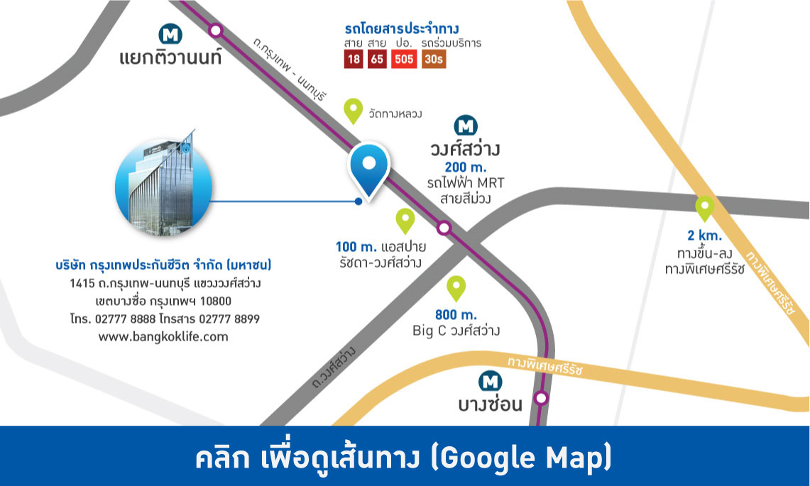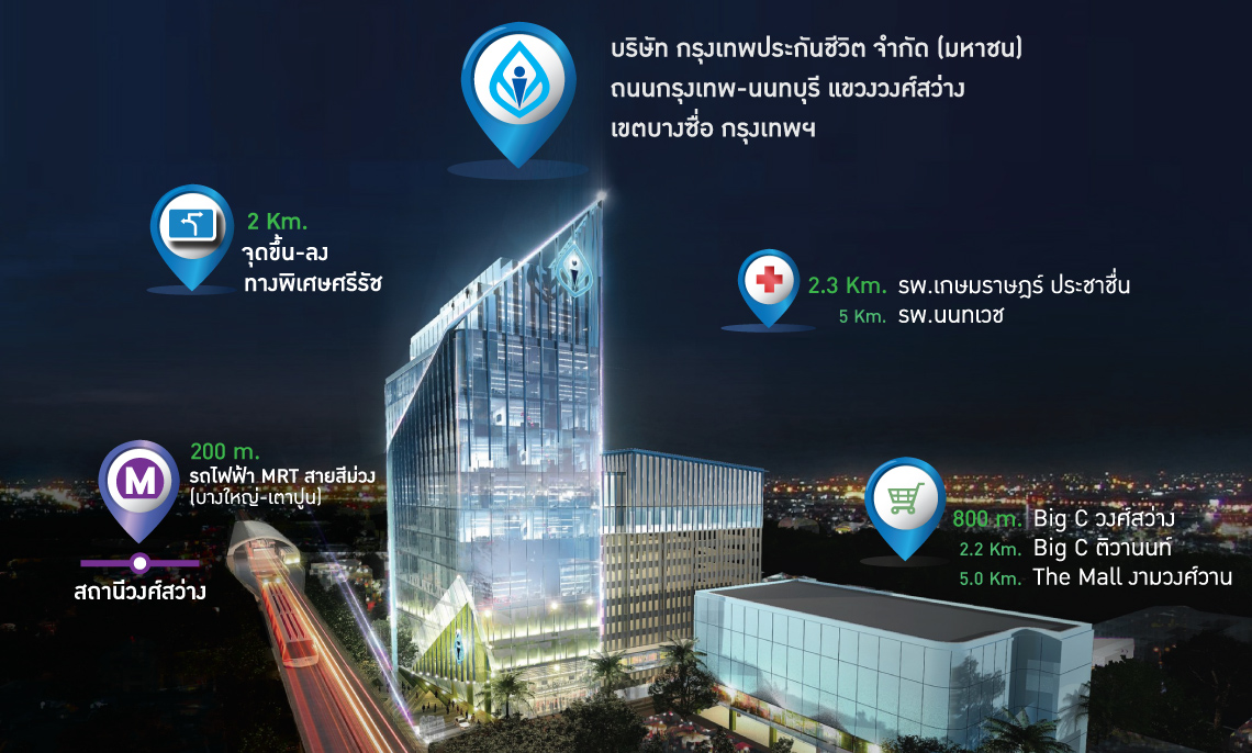 อาคารสำนักงานใหญ่แห่งใหม่ของกรุงเทพประกันชีวิตตั้งอยู่บนโลเคชั่นที่มีศักยภาพแห่งใหม่ของกรุงเทพ เดินทางสะดวกเพียง 200 เมตร จาก MRT สายสีม่วง สถานีวงศ์สว่าง และ 2 กิโลเมตร จากจุดขึ้นลงทางพิเศษศรีรัช และรายล้อมด้วยแหล่งอำนวยความสะดวกมากมาย