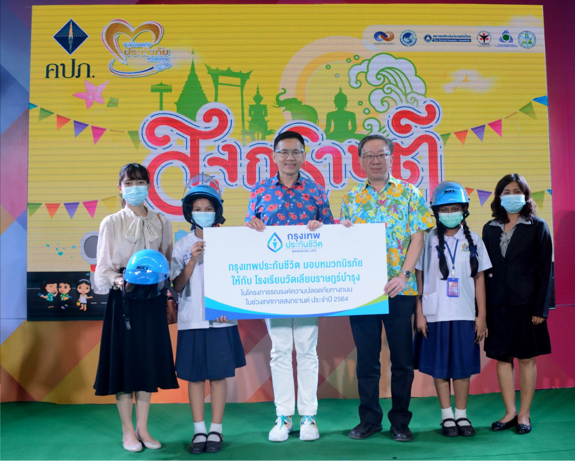นายนรินทร์ เอกวงศ์วิริยะ บริษัท กรุงเทพประกันชีวิต จำกัด (มหาชน) (ที่ 3 จากขวา) ผู้บริหารฝ่ายการตลาดและสื่อสารองค์กร และ ดร.สุทธิพล ทวีชัยการ เลขาธิการคณะกรรมการกำกับและส่งเสริมการประกอบธุรกิจประกันภัย (ที่ 3 จากซ้าย) ร่วมมอบหมวกนิรภัย เพื่อป้องกันอุบัติเหตุในช่วงเทศกาลสงกรานต์ ให้กับคณะครูและนักเรียน โรงเรียนวัดเลียบราษฎร์บำรุง สำนักงานเขตบางซื่อ ในงานแถลงข่าวพิธีเปิดโครงการรณรงค์ความปลอดภัยทางถนนในช่วงเทศกาลสงกรานต์ ประจำปี 2564 พร้อมร่วมส่งมอบความห่วงใยพร้อมความสุขช่วงเทศกาลสงกรานต์ ด้วยการเข้าร่วมโครงการมอบกรมธรรม์ประกันภัยกลุ่ม 10 บาท “สงกรานต์อุ่นใจ นิวนอร์มอล ซุปเปอร์พลัส” (ไมโครอินชัวรันส์) คุ้มครองกรณีเสียชีวิต สูญเสียมือ เท้า สูญเสียสายตา หรือทุพพลภาพถาวรสิ้นเชิง เนื่องจากอุบัติเหตุ ให้ประชาชนคลายกังวลเมื่อเดินทางกลับภูมิลำเนาในช่วงสงกรานต์ พร้อมเพิ่มความคุ้มครองกรณีได้รับผลกระทบจากการฉีดวัคซีน COVID-19 สูงสุดถึง 30 วัน ณ ศูนย์บริการด้านการประกันภัย สำนักงาน คปภ. ถนนรัชดาภิเษก กรุงเทพฯ เมื่อเร็วๆ นี้
