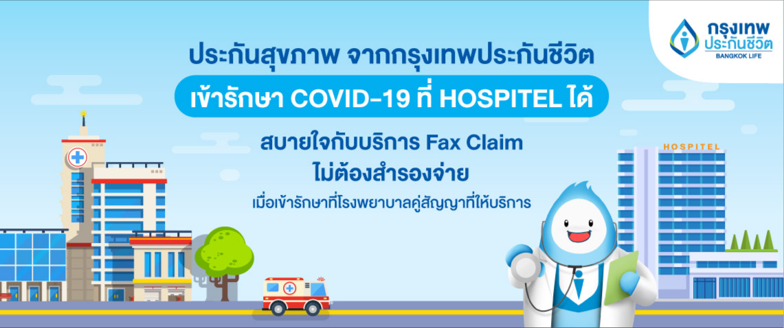 ทั้งนี้ หากมีความจำเป็นต้องเข้ารักษาตัวในช่วงสถานการณ์โควิด-19 กรุงเทพประกันชีวิตมอบความสบายใจกับผู้เอาประกันภัยด้วยบริการแฟกซ์เคลมกับโรงพยาบาลคู่สัญญา เมื่อเข้าพักรักษาตัวในฐานะผู้ป่วยในโดยไม่ต้องสำรองจ่ายจากโรงพยาบาลทั่วประเทศ สำหรับการรักษาโรคติดเชื้อไวรัสโควิด-19 ประกันสุขภาพของกรุงเทพประกันชีวิตทั้งแบบรายบุคคลและรายกลุ่ม บริษัทให้ความคุ้มครองผู้ป่วยในตามหลักเกณฑ์ของกระทรวงสาธารณสุข ณ วันเข้ารับการรักษาพยาบาล ภายใต้เงื่อนไขกรมธรรม์ ทั้งนี้ ครอบคลุมถึงการส่งตัวตามเกณฑ์การส่งตัวจากโรงพยาบาลต้นทาง ไปยังโรงพยาบาลสนาม (Field Hospital) และหอผู้ป่วยเฉพาะกิจ (Hospitel) ที่ได้รับอนุมัติให้จัดตั้งขึ้นตามเงื่อนไขและข้อกำหนดของกระทรวงสาธารณสุข สามารถตรวจสอบรายชื่อโรงพยาบาลคู่สัญญา ที่ให้บริการรักษาพยาบาล ณ หอผู้ป่วยเฉพาะกิจนอกสถานพยาบาล (Hospitel) สะดวกสบาย สามารถแฟกซ์ เคลมได้ ไม่ต้องสำรองจ่าย ได้ที่เว็บไซต์ www.bangkoklife.com หรือ http://bit.ly/BLA-Hospitel